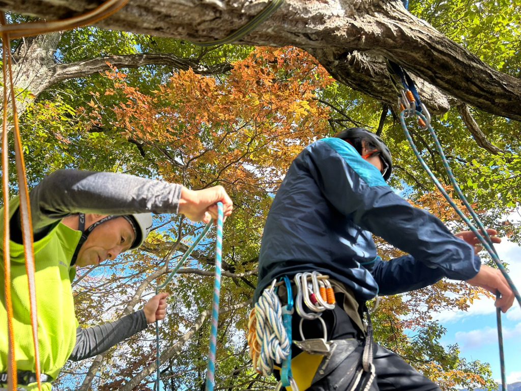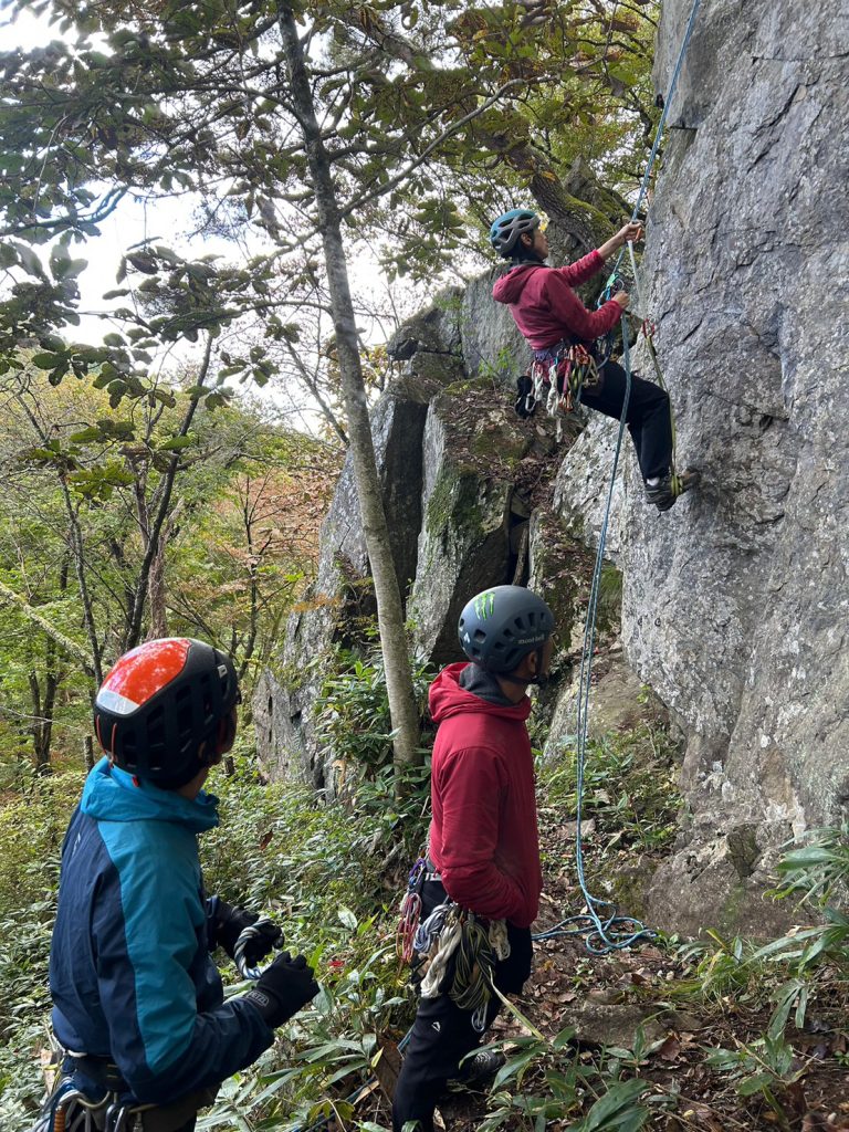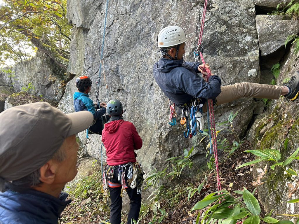 「サラッとできたら男前!ロープワークトレーニング」南川目の岩場で行いました!今回はダブルロープでの懸垂下降からの登り返しです、参加者は何度も何度も練習しました。