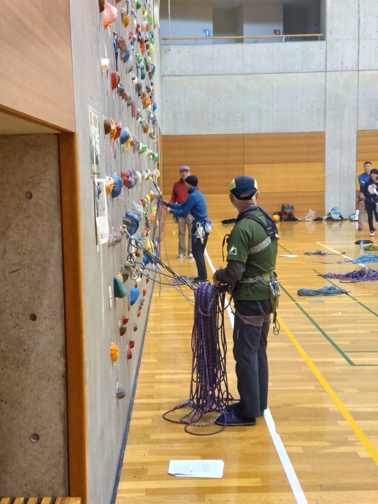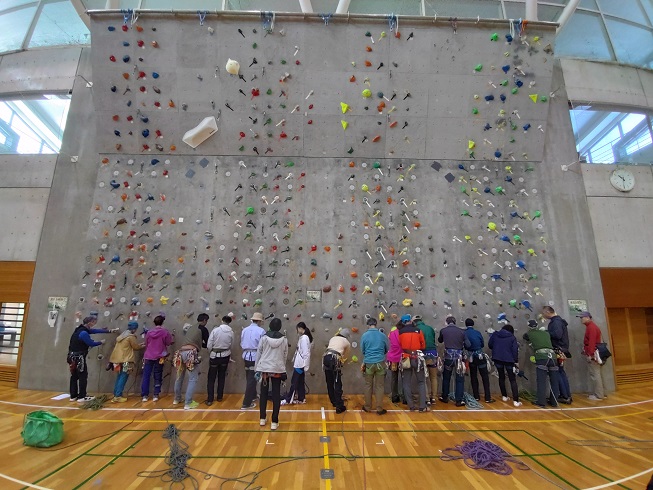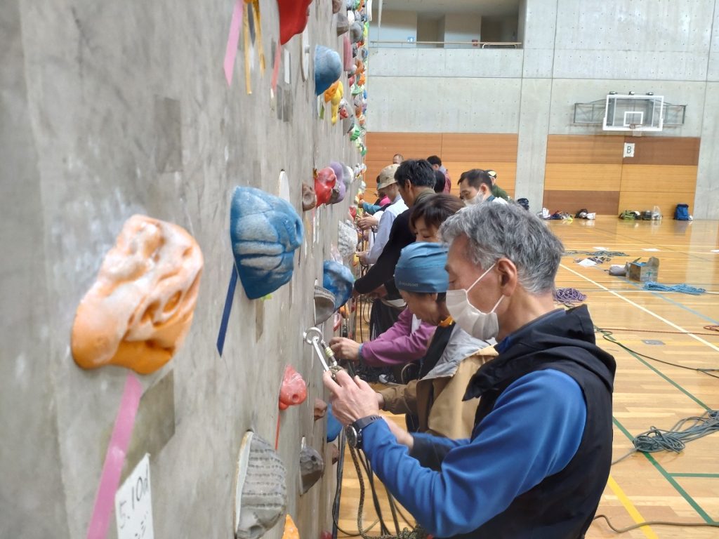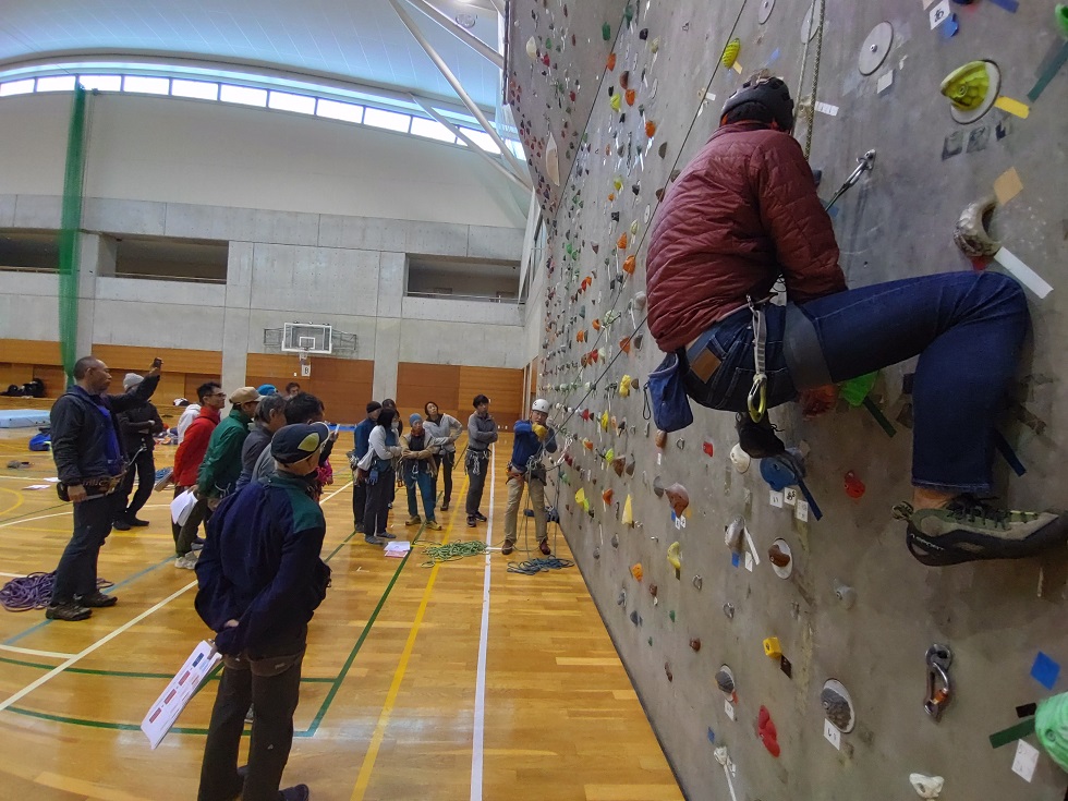 今年の勤労者山岳連盟のクライミングレスキュー技術研修会は岩手県立大学体育館で行われ、30名の会員が様々な事故想定を検証しました。