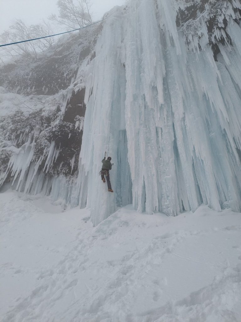 初日は南岸低気圧の影響で道路渋滞と第2リフト運休で、登攀開始が遅れたので、ミニ氷柱を各自1本だけ登り回収。今年のミニ氷柱はバーチカルが長い。