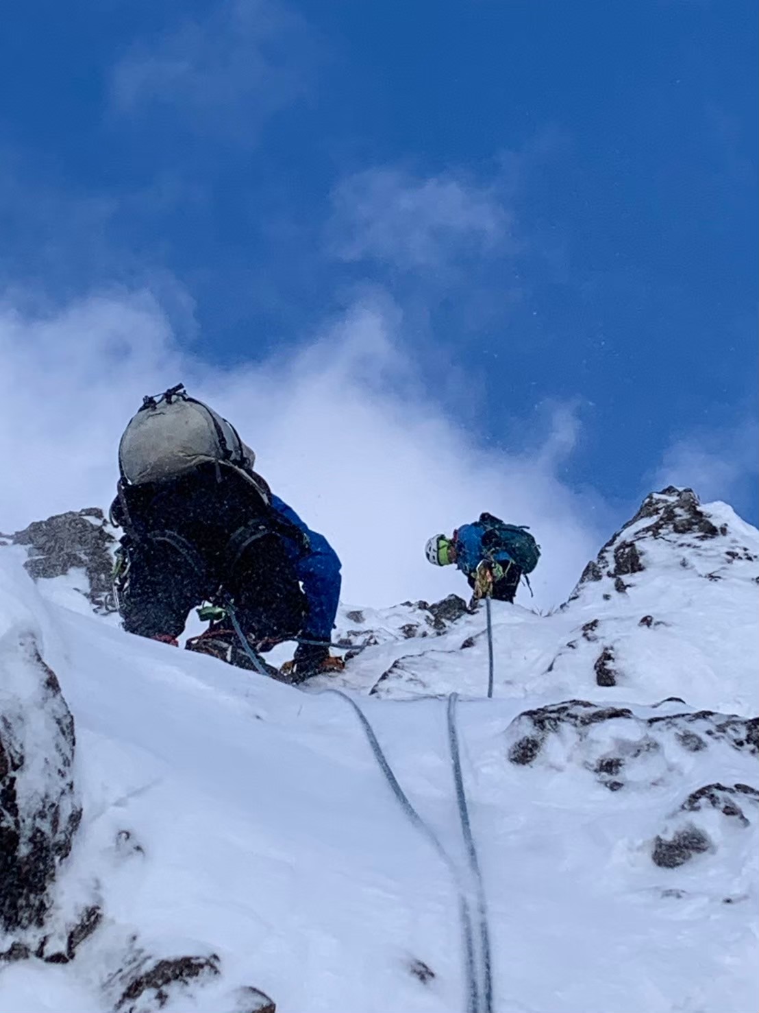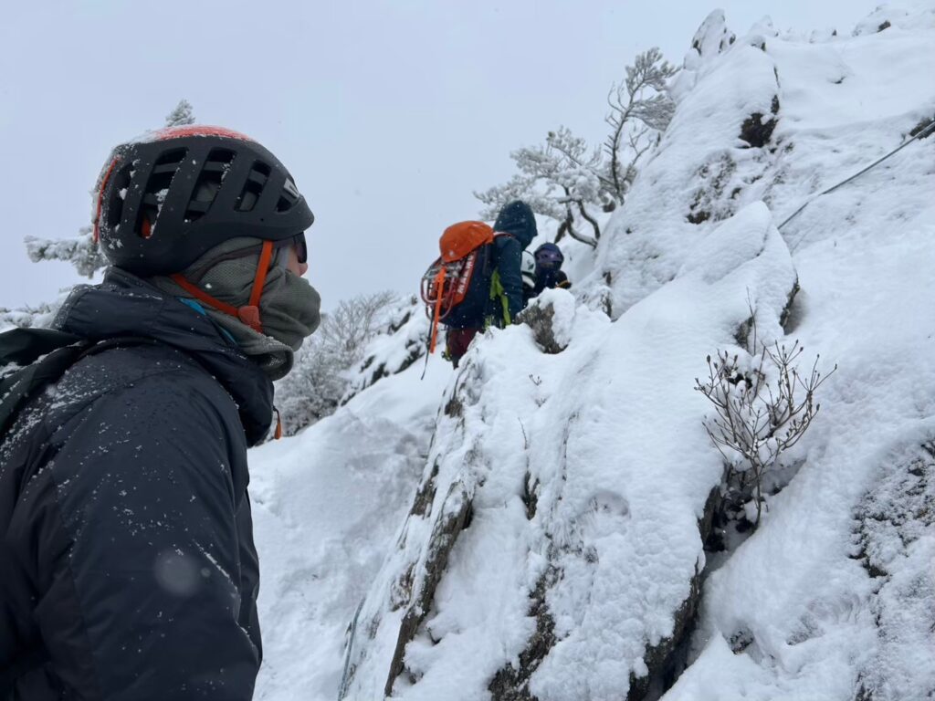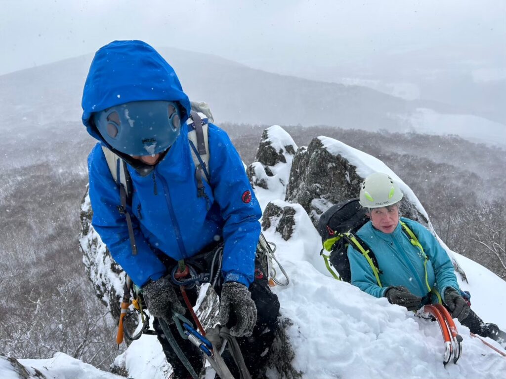 兜明神岳岩でのミックストレーニング、そこそこ雪もあり、お天気もよく、いいトレーニングになりました。積雪期はグローブをはめての操作となり、寒さや風の要素も加わり、無雪期と比べてもギアの扱いが複雑で修練が必要です。今回の参加者にも積雪期登山を目標としている方もいたので、良い時間になったと思います。